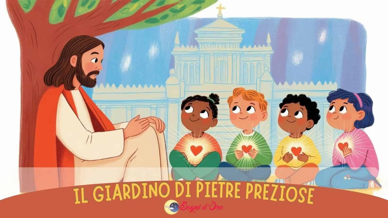 Un giorno, un uomo saggio di nome Gesù si sedette sotto un grande albero e molti bambini gli si radunarono intorno. Indicando il giardino splendente, disse: “Vedete tutte queste pietre preziose? Verrà un giorno in cui non ne resterà una sull’altra”.